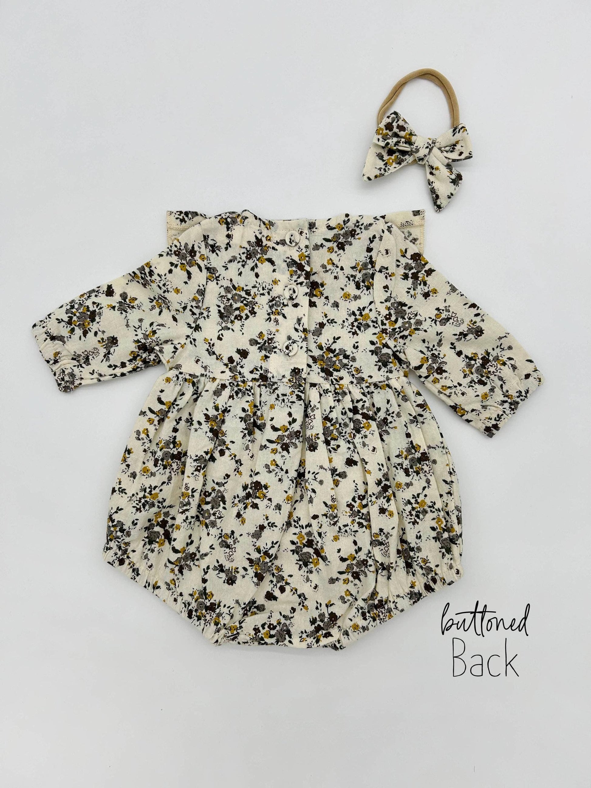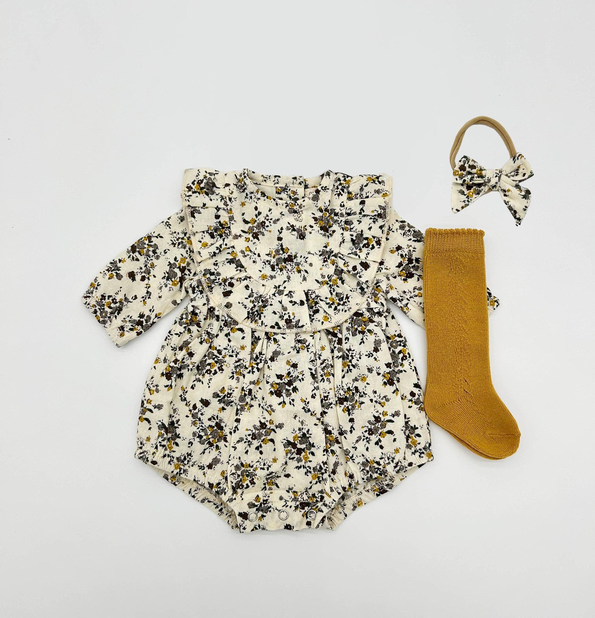 This sweet Vintage floral romper is crafted from soft, breathable cotton, perfect for your little one's comfort all day long. Featuring functional buttons for easy dressing and diaper snaps for quick changes, it’s both stylish and practical. The matching bow headband completes the look, adding a touch of charm to any outfit. Ideal for outings, photoshoots, or everyday play, this romper set is sure to become a favorite in your little one’s wardrobe.